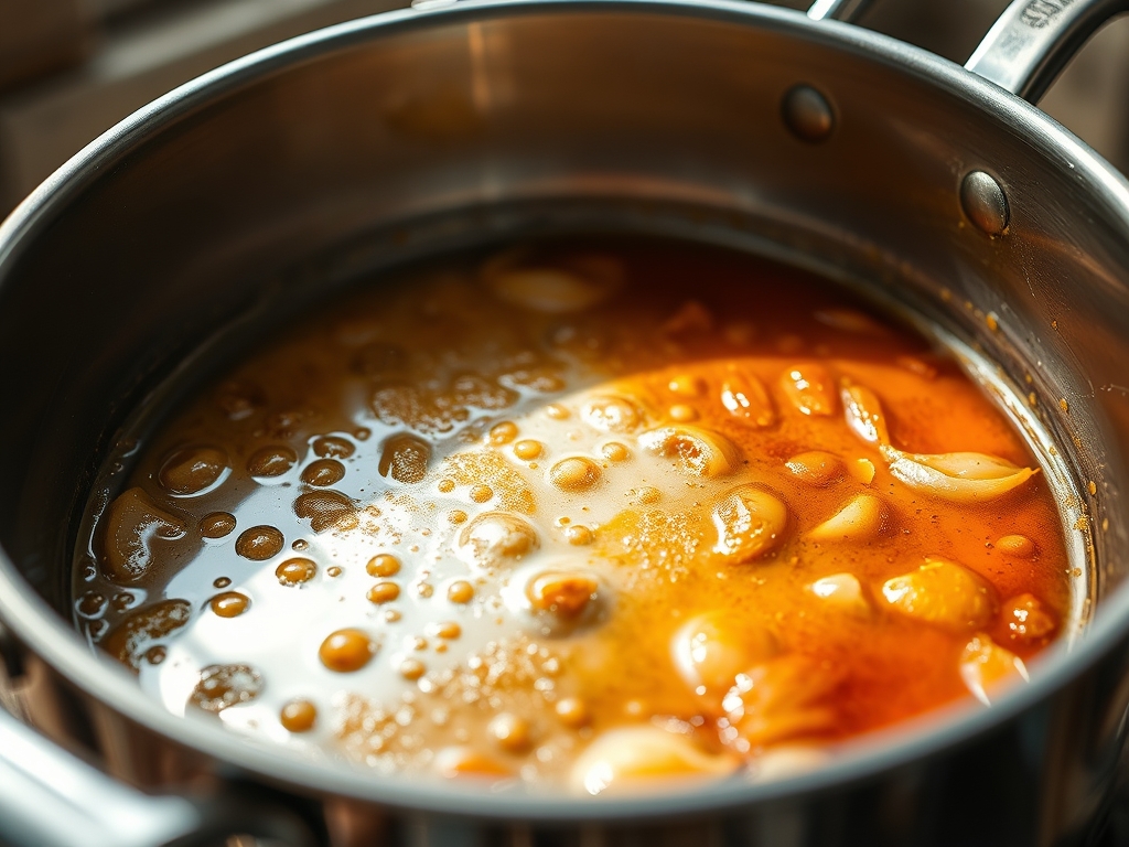 Begin by placing your Dijon mustard and lemon juice into a small stainless steel saucier. Slowly whisk in the olive oil to create a stable emulsion.